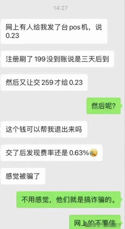 其次,面对那些能精准报出你姓名和机器品牌的客服,不要当朋友,十有八九是骗子,一定找官方渠道核实信息,或者找给你办POS机的代理商核实信息,不要轻信!!!